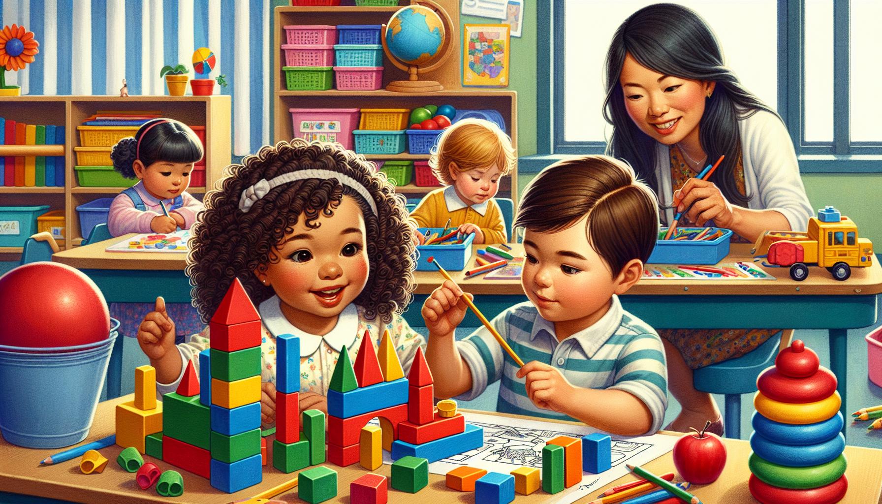 Key developmental milestones include mastering self-care tasks, following multi-step directions and participating in collaborative play. The learning environment emphasizes hands-on exploration with designated areas for different types of activities.